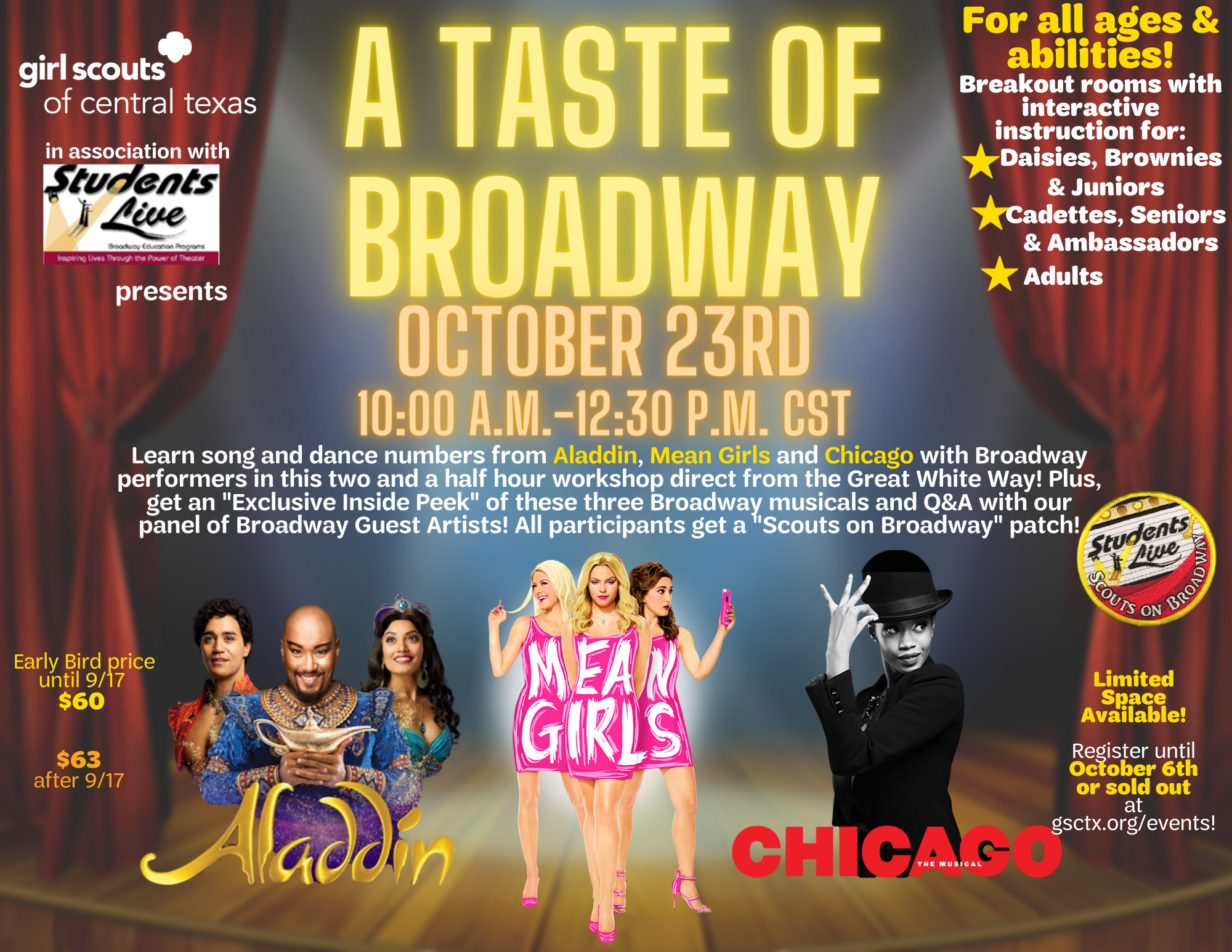 Learn song and dance numbers from Aladdin, Mean Girls, and Chicago from professionals who have appeared on Broadway in these shows! Plus, get an exclusive inside peek into these three Broadway musicals and enjoy a Q&A with our panel of Broadway guest artists. You’ll receive a Scouts on Broadway patch following the event.